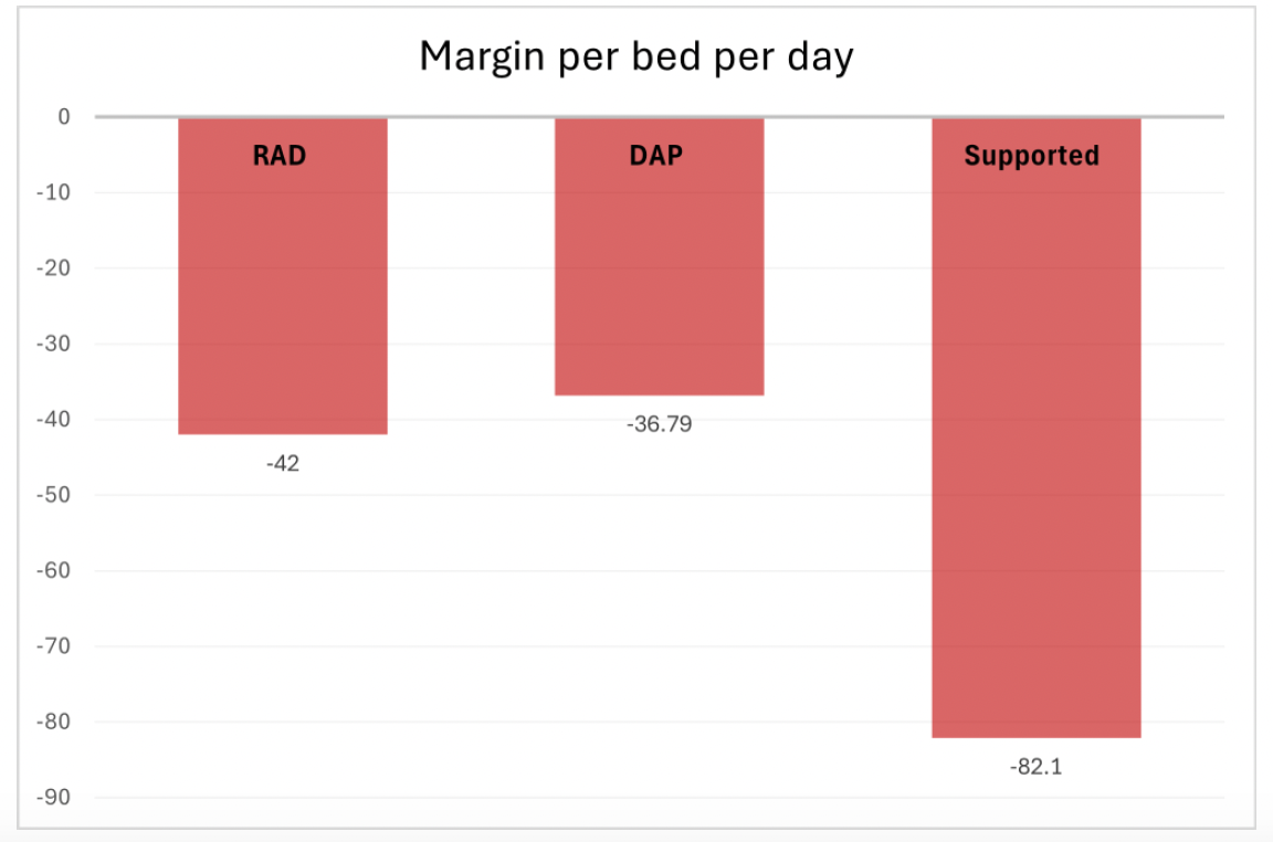 The below table and graph show the difference in margins between different cohorts of residents. These figures are a real example from a provider in the UnitingCare Network receiving a 6% return on investment (supplemented by a 2% RAD retention or receiving a DAP at the MPIR of 8.38%).